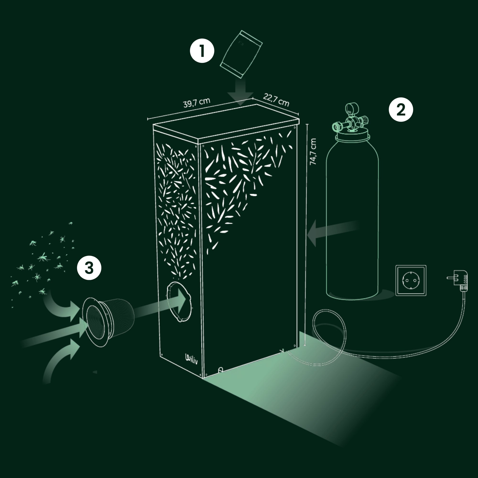 Pas d’insecticide. Pas de produits chimiques diffusés dans votre jardin. Le piège attire simplement les moustiques avec du CO₂, comme le ferait un être humain. Ils s’approchent. Ils sont capturés. C’est tout.
